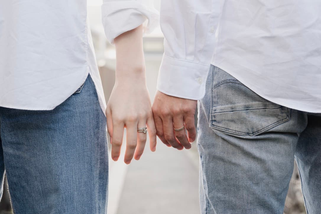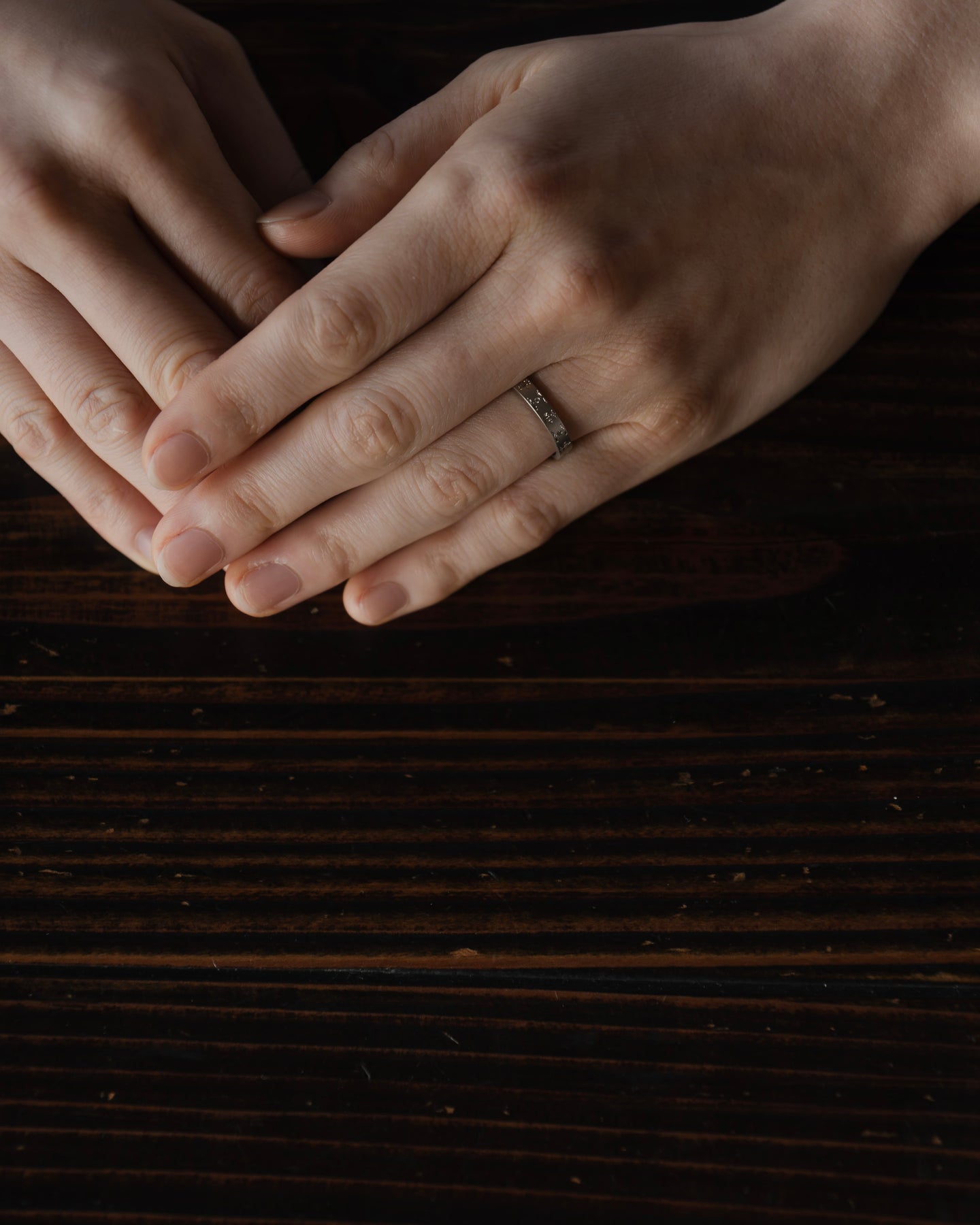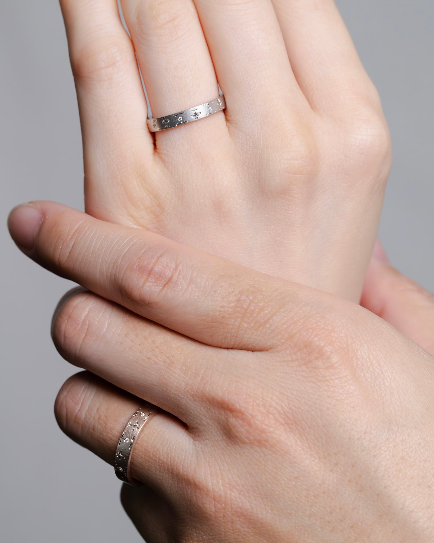 婚約指輪と結婚指輪、二つが折り重なる姿を追求。 重ね付けを想定したデザインにより、一本ずつでは出せない一体感のある造形美を実現しています。