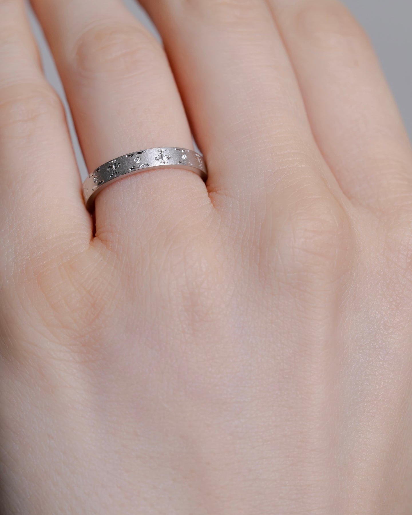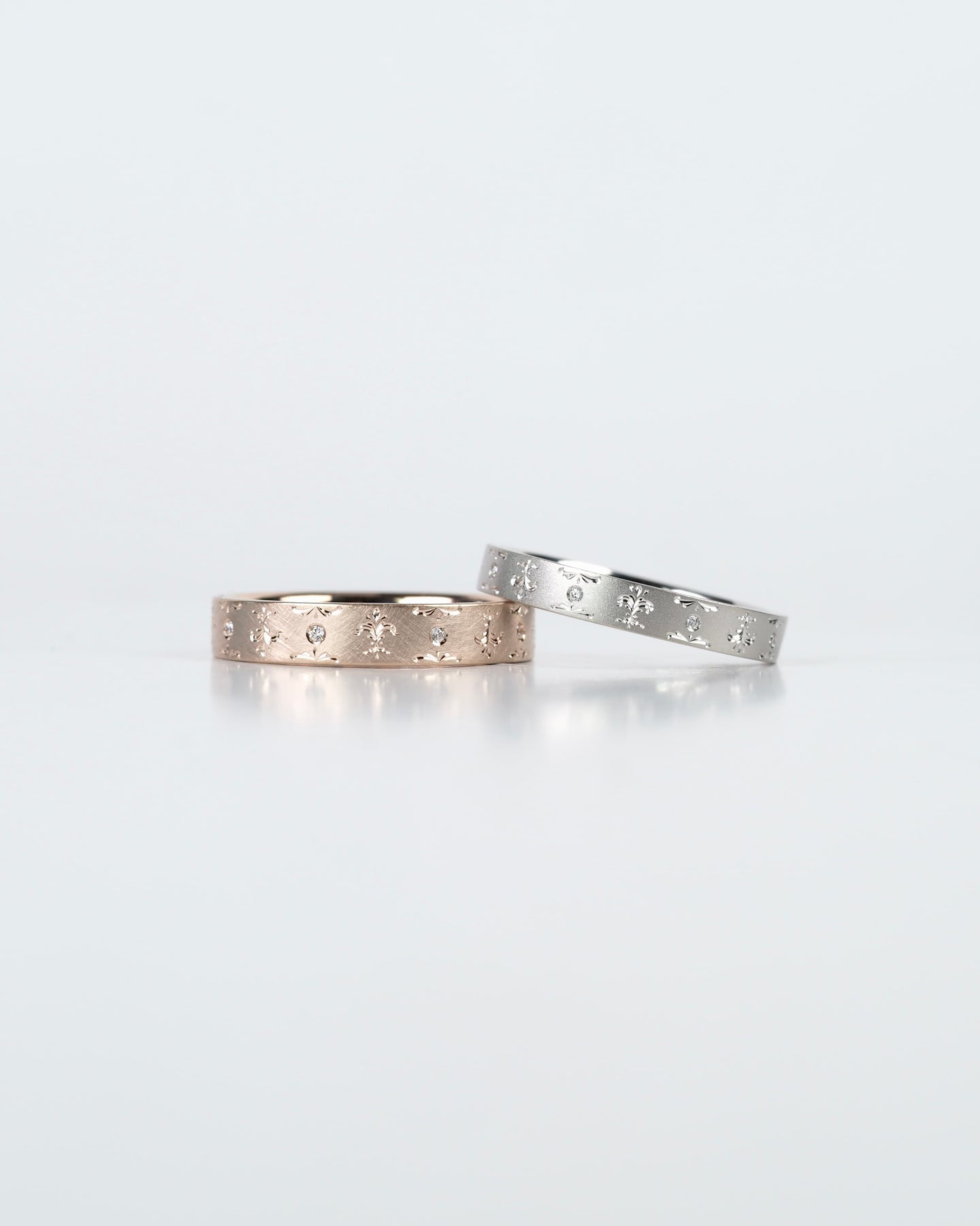 地金の光沢と、洋彫りの意匠を愉しむデザイン。表面に施された仕上げ加工の質感と、季節を象徴する彫りがより際立ったモデルです。