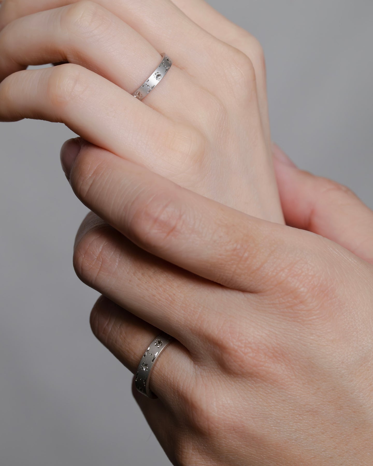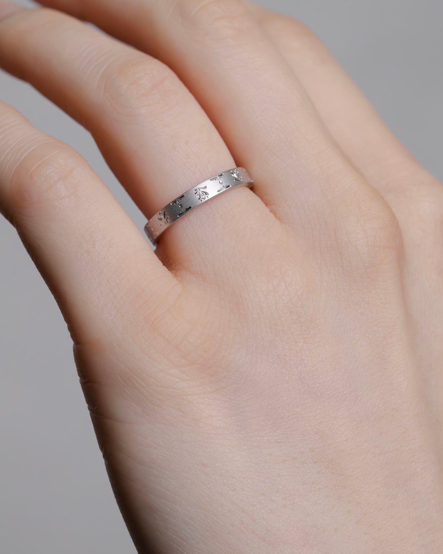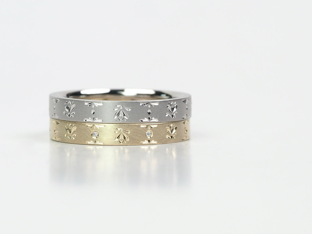 花弁の重なりや雪景色の煌めきを彫りで表現した結婚指輪。